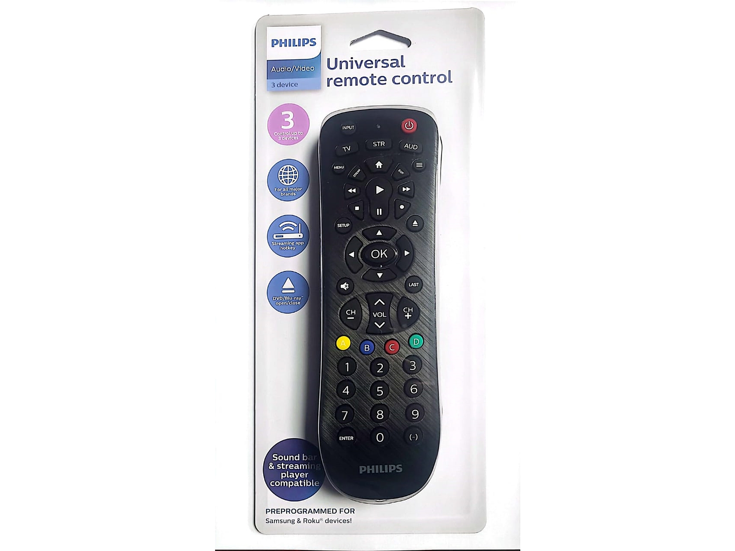 Control de múltiples dispositivos: funciona hasta 3 componentes diferentes de audio y video como televisores, reproductores Blu-Ray/DVD, receptores de cable/satélite, cajas Roku y otros reproductores multimedia de transmisión, barras de sonido y más. La mejor biblioteca de códigos remotos: este control remoto universal funciona con todas las principales marcas y soporta miles de los últimos equipos de audio/video, No funciona con Roku Streaming Sticks, Fire TV Sticks, u otros dispositivos de transmisión Rf Configuración sencilla: este control remoto viene preprogramado para televisores Roku y Samsung e incluye un video de configuración en línea fácil de seguir que proporciona una configuración sin problemas, tecnología de escaneo automático y un control de volumen maestro, lo que te permite controlar el volumen sin importar qué dispositivo estés operando