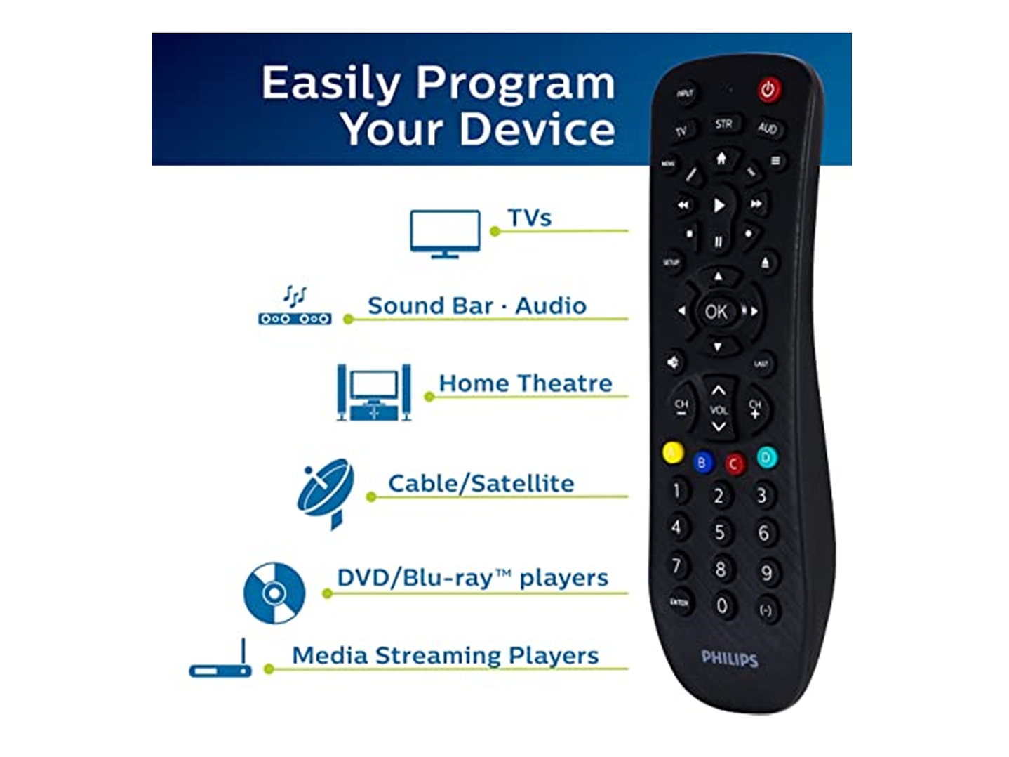 Dispositivos compatibles: TV, DTV, CABLE, SAT, Blu-ray reproductor, DVD, dispositivo de streaming