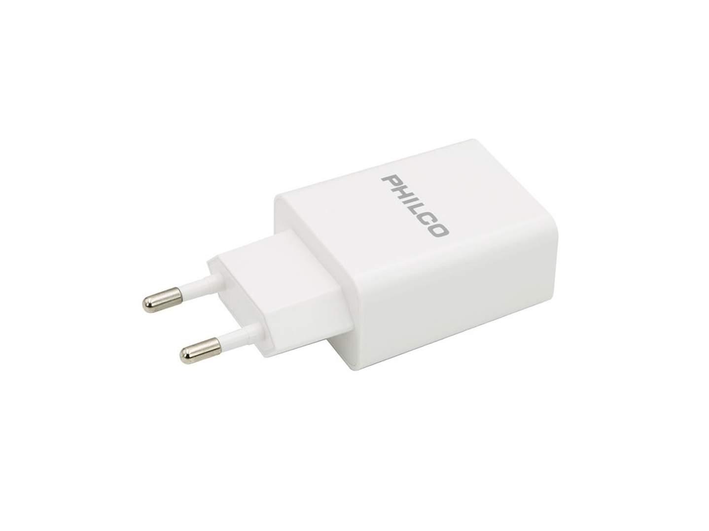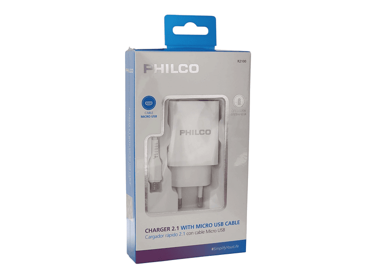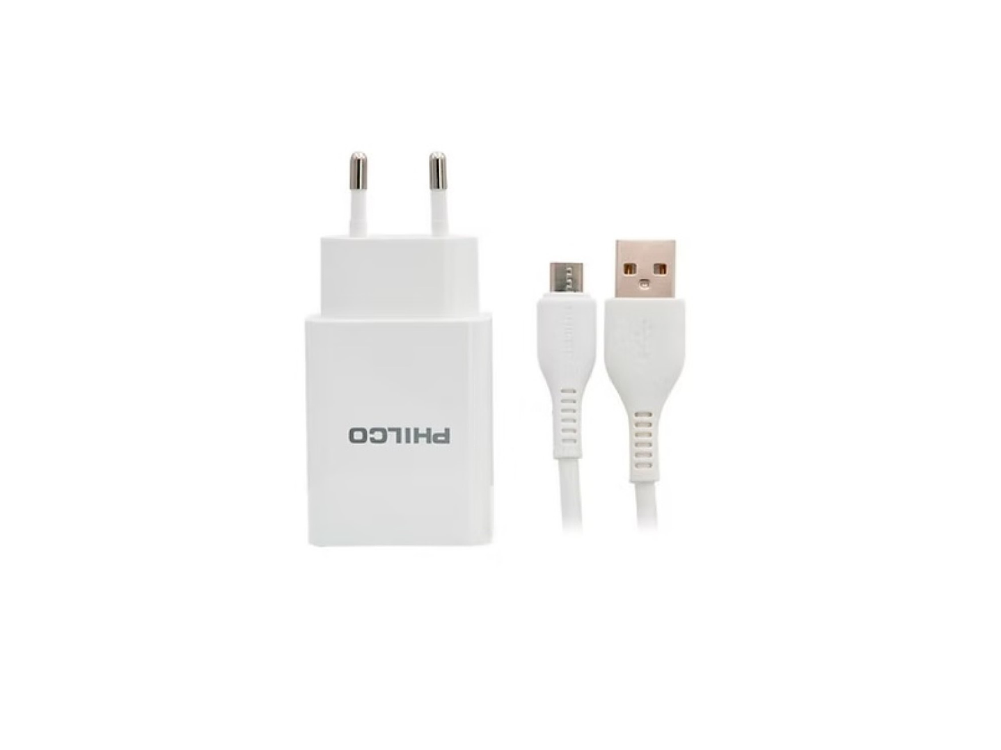 Cargador Rápido 2.1A Doble USB + Cable Micro USB Philco al Por Mayor. Carga eficiente, segura y práctica para tu día a día