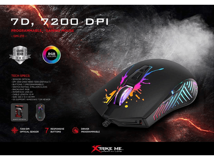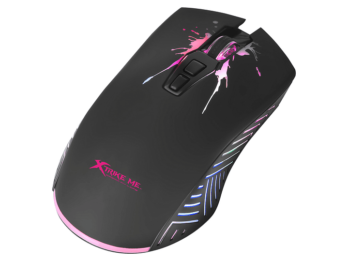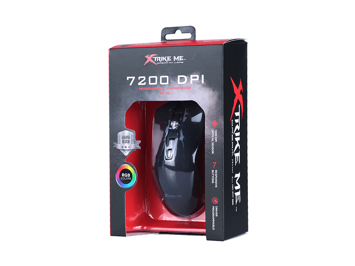 Mouse de juego modelo GM-215 Xtrike Me por mayor Diseño de alto perfil con soporte completo para la palma y el pulgar. Rueda de desplazamiento retroiluminada con agarre mejorado Luz de fondo mixta de colores con efecto de respiración, 7200 sensores de videojuegos ópticos de alto rendimiento.