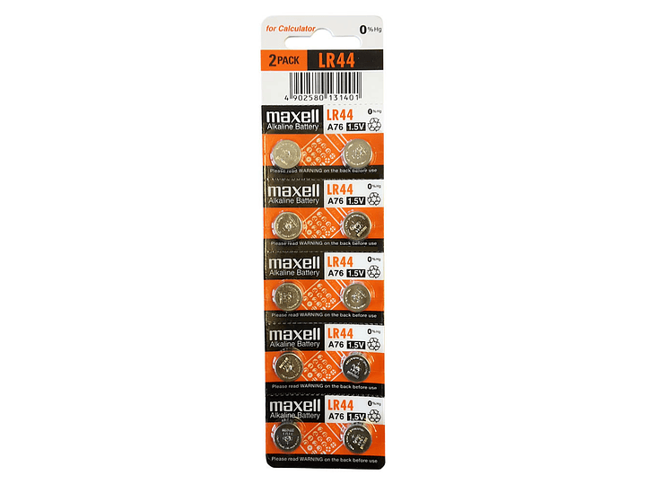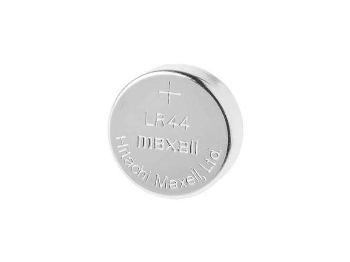 Esta es una pila de botón de tamaño LR44 de marca Maxell al por mayor, perfecta para relojes, laser y otras aplicaciones portátiles. Tiene un voltaje nominal de 1,5V, aunque en la práctica parte cerca de 1,6V y lentamente va bajando hasta unos 1V a medida que es usada. La capacidad es de 110mAh, para otros niveles de consumo esta capacidad se puede ver reducida.
