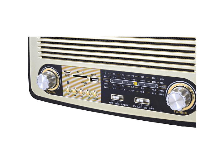 La Radio Retro BT Vintage Audiopro Portátil AP02051 es el equilibrio perfecto entre el estilo retro y la tecnología actual. Con su diseño nostálgico, esta radio no solo te permite disfrutar de emisoras FM, AM y SW1-2, sino que también tiene funciones modernas como la reproducción de MP3 desde un puerto USB, tarjetas SD/microSD y conexión por Bluetooth para que puedas transmitir música directamente desde tu dispositivo. ¡Ideal para quienes buscan un sonido auténtico y práctico en un diseño vintage!