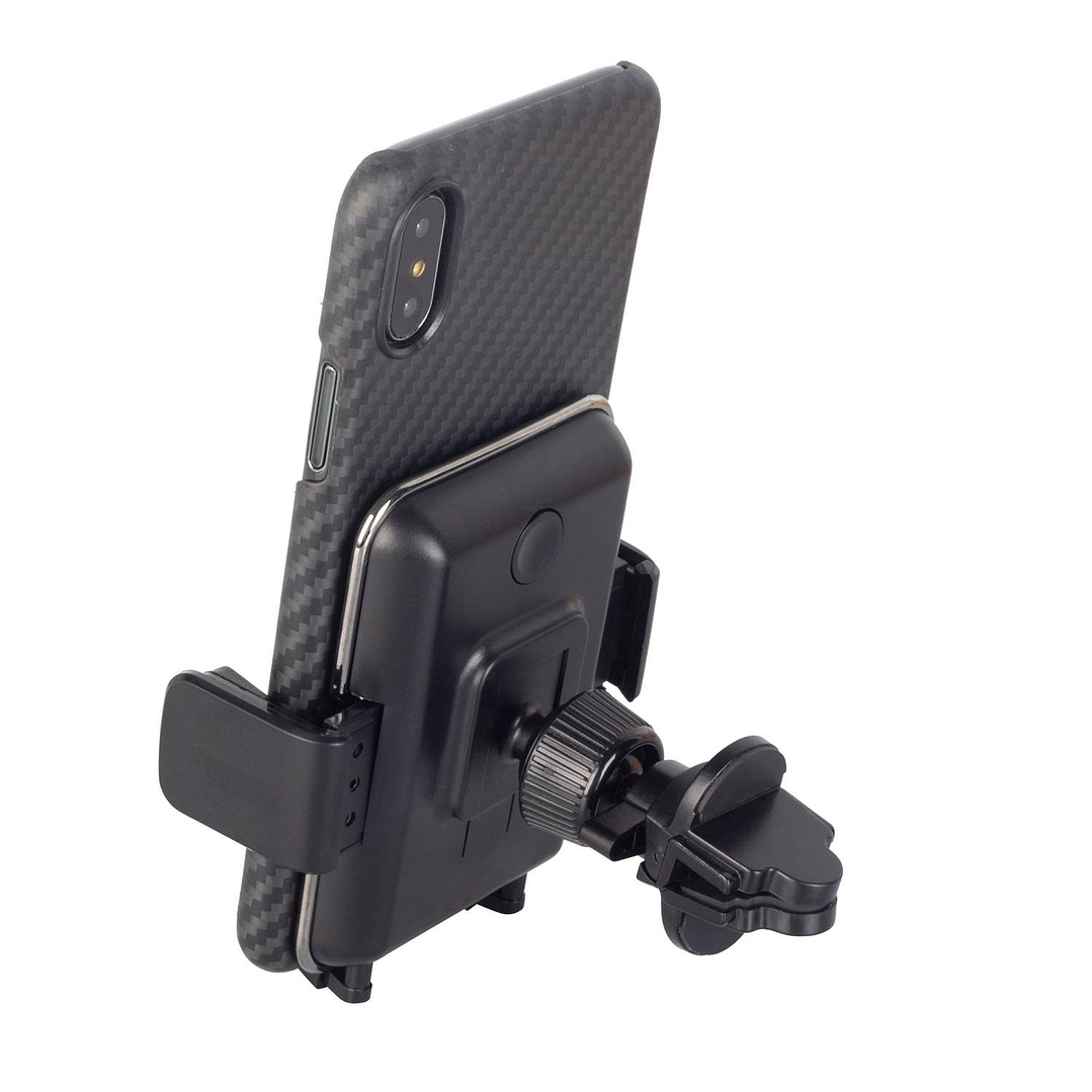 La manera de poner el smartphone de manera rápida y sencilla al alcance de sus manos es sobre el ducto de ventilación del auto, asegurándose de que sea firme y pueda girar hasta un ángulo de 360° para que pueda usar programas de GPS como el Waze o Google maps para evitar el tráfico. Compatible con cualquier equipo móvil con las características mencionadas.