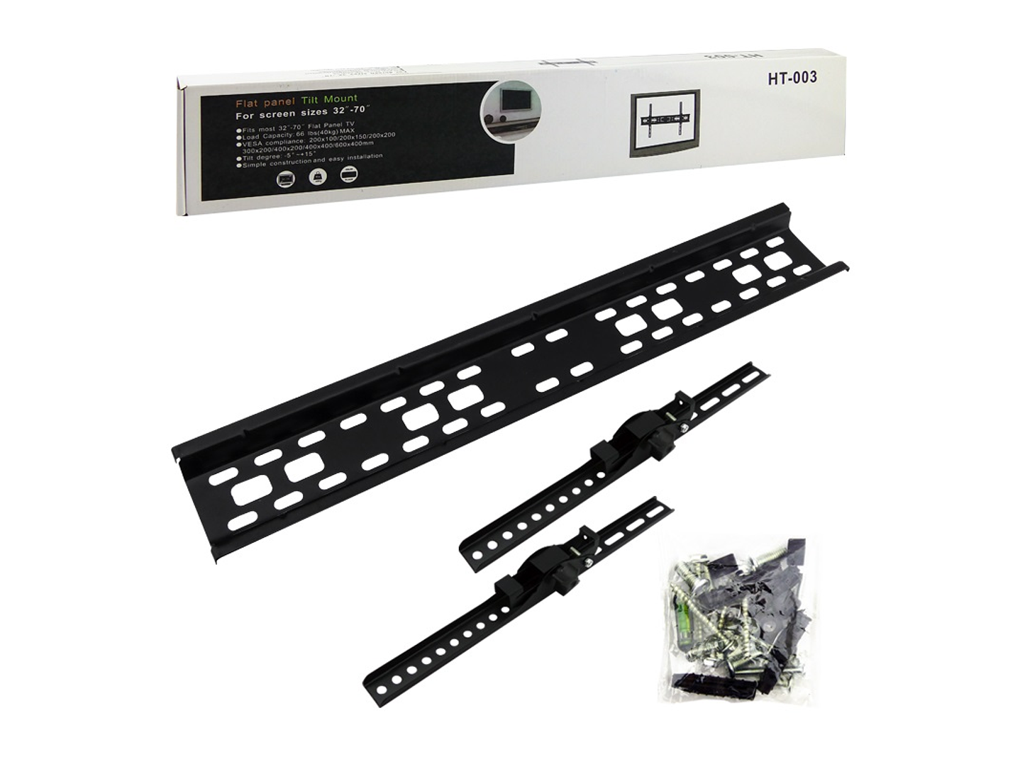 Soporte TV LED de 32” a 70” modelo HT-003 al por mayor, cuenta con inclinación y soporta hasta 40 kilos. Está fabricado en metal. Producto en caja. Disponible en color negro.