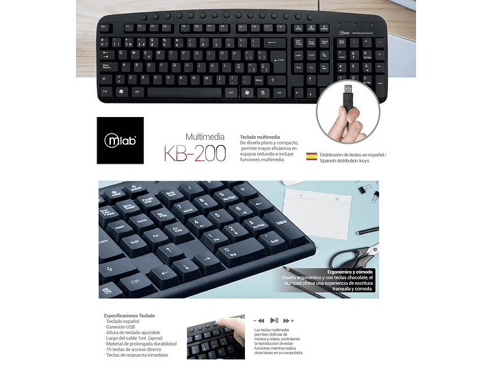 Teclado multimedia De diseño plano y compacto, permite mayor eficiencia en espacio reducido e incluye funciones multimedia marca MLAB Modelo: K200-8338 al por mayor.