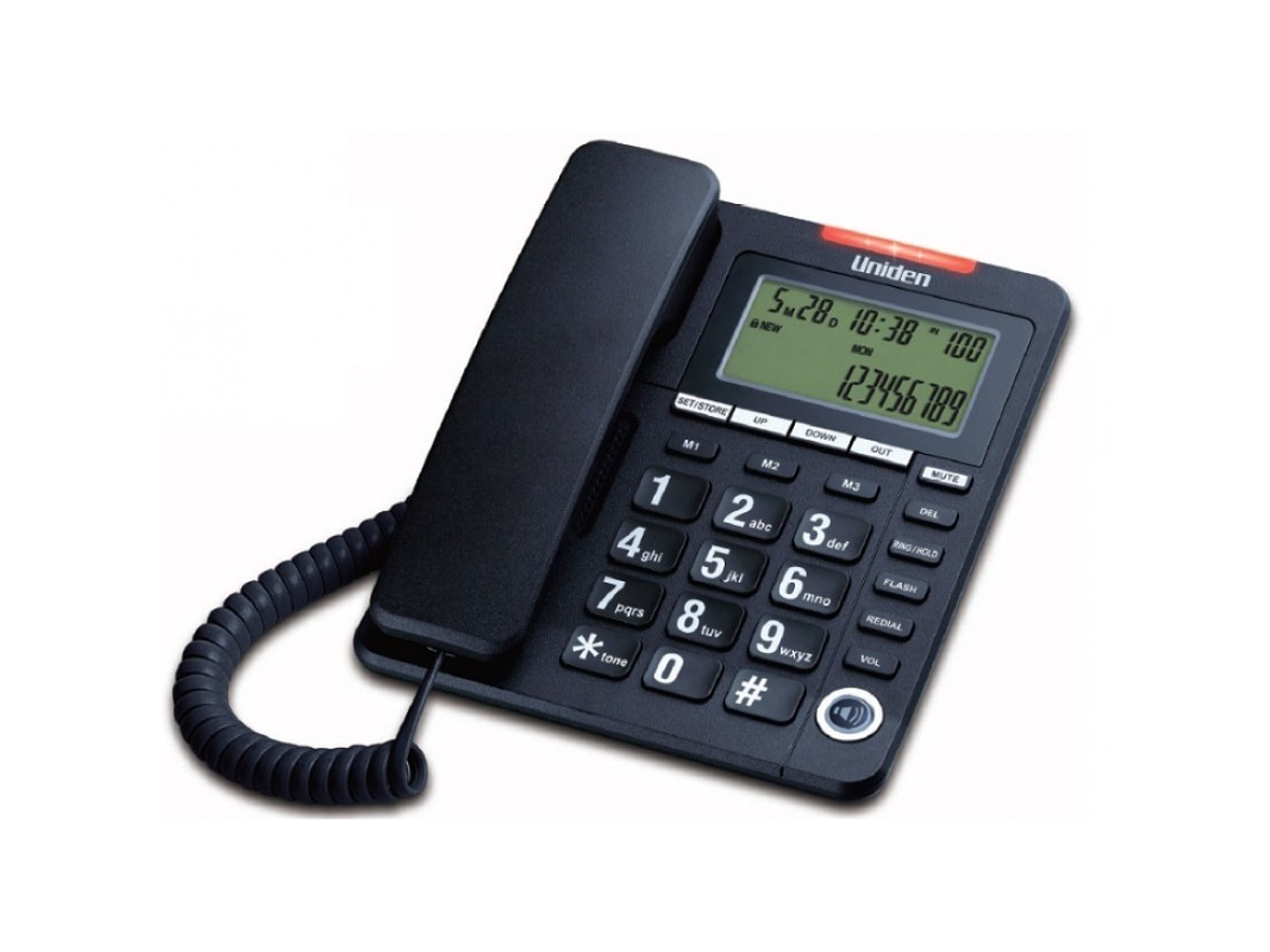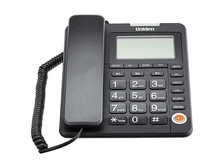 Teléfono Sobremesa Uniden con altavoz AS7408 convencional cableado de Mayorista, Teléfono Sobremesa con botones grandes y gran pantalla. Función de altavoz unidireccional 3 memoria directa. Música en espera· Ajuste de flash· Alarma· No molestar· Selección de timbre· Ajuste de fecha y hora· Funciona sin batería. Conexión segura y fiable con estilo, transforma la comunicación tradicional en una experiencia moderna, sin pérdidas de comodidad ergonómica. * No usa chip.